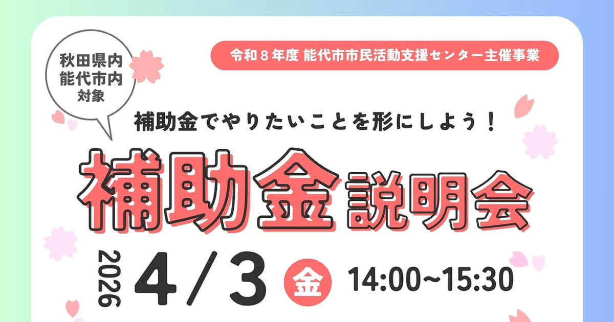 申込フォーム:4月3日(金)【秋田県内・能代市内対象】補助金でやりたいことを形にしよう!補助金説明会